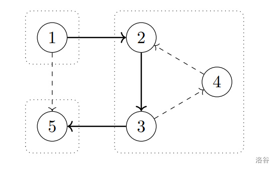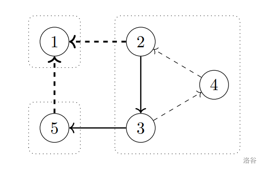 The directions on the dashed edges can be removed. Indeed, the edge cannot be oriented in the opposite direction, because otherwise, vertices , , , and would belong to the same strongly connected component. The edges and cannot be oriented differently either, because then vertices , , and would not belong to the same strongly connected component.