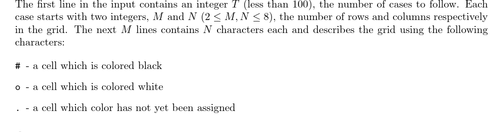 输入第一行为数据组数T(T≤100)。每组数据第一行为两个整数m和n(2≤n,m≤8)。以下m行每行包含n个字符,“#”表示黑格,“o”表示白格,“.”表示尚未涂色的格子。 输出格式