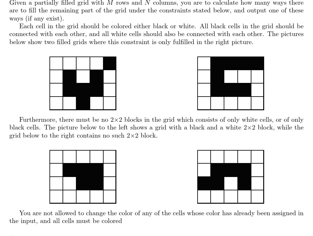 一个m×n的网格,有的格子已经染上黑色或白色,现在要求将所有的未染色格子染上黑色或白色,使得满足以下2个限制: