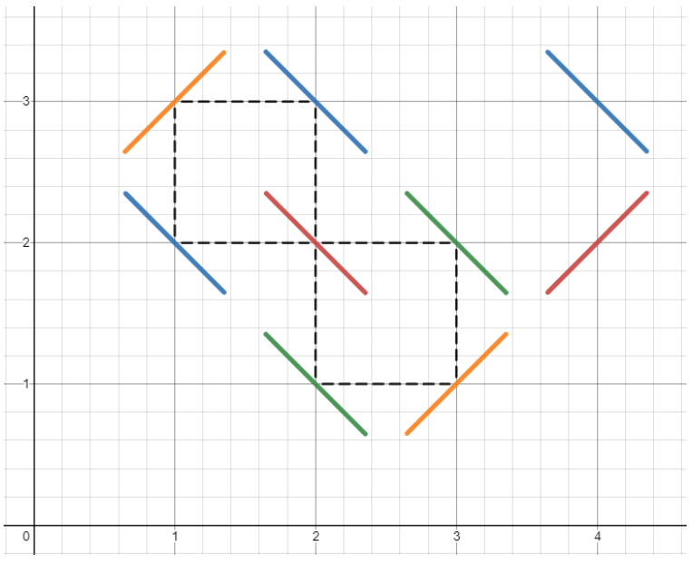 弹球游戏在一个二维平面上进行,在平面上有 块挡板,它们均与坐标轴呈 度角摆放,长度为 单位长度。挡板由其中点坐标 和一个字符 \