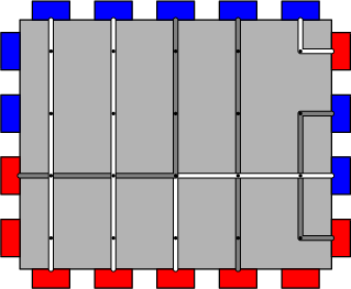 The component is built on top of a breadboard — a grid-like base for a microchip. The breadboard has rows and columns, and each row-column intersection contains a node. Also, on each side of the breadboard there are ports that can be attached to adjacent nodes. Left and right side have ports each, and top and bottom side have ports each. Each of the ports is connected on the outside to one of the parts bridged by the breadboard, and is colored red or blue respectively.